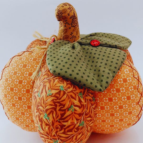 Abobora em tecido com recheio de areia e manta siliconada, tendo por foco principal ser decorativa.