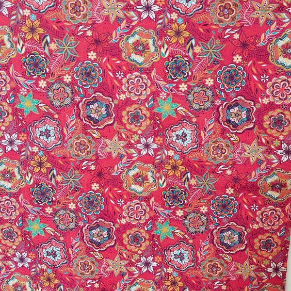 Tecido tricoline digital para patchwork 100% algodão com estampa floral e folhagens em tons neutros em fundo vermelho queimado para uso em peças artesanais, vestuários, patchwork, patch aplique e artesanatos em geral.