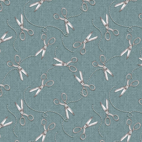 Tecido tricoline digital para patchwork 100% algodão com estampa de tesouras em fundo azul jeans, para uso em peças artesanais, vestuários, patchwork, patchaplique e artesanatos em geral.