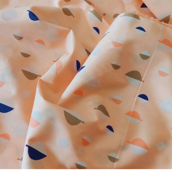 Tecido tricoline para patchwork 100% algodão com estampa de folhas coloridas e fundo em salmão para uso em peças artesanais, vestuários, patchwork, patchaplique e artesanatos em geral.